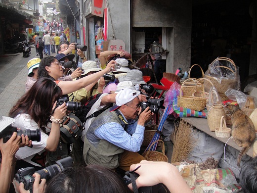 道端を歩くとカメラマンに囲まれ写真撮影。その後、わら帽子を売るお店の商品台