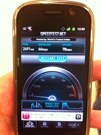 まずはスピートテスト。結果は予想通りな速度。100KbpsはおろかISDN並み。。