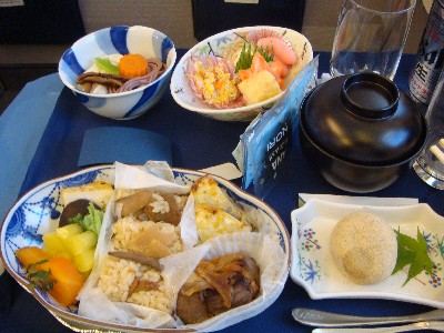 ※ 機内食。ミニワインを飲みながら、いただきつつ雑学王やタモリの番組を見て過ごす