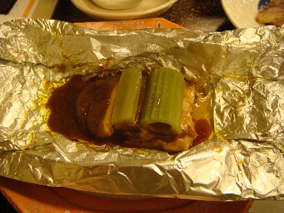 おそばの次は、中標津産のミルキーポークのスモーク、マスのホイル包み焼き、そして写真はないけどお刺身同様選択で選んだやまべの炭火焼に、ご飯ものとして炊き込みご飯、さらには地鶏のつくね鍋と続きます